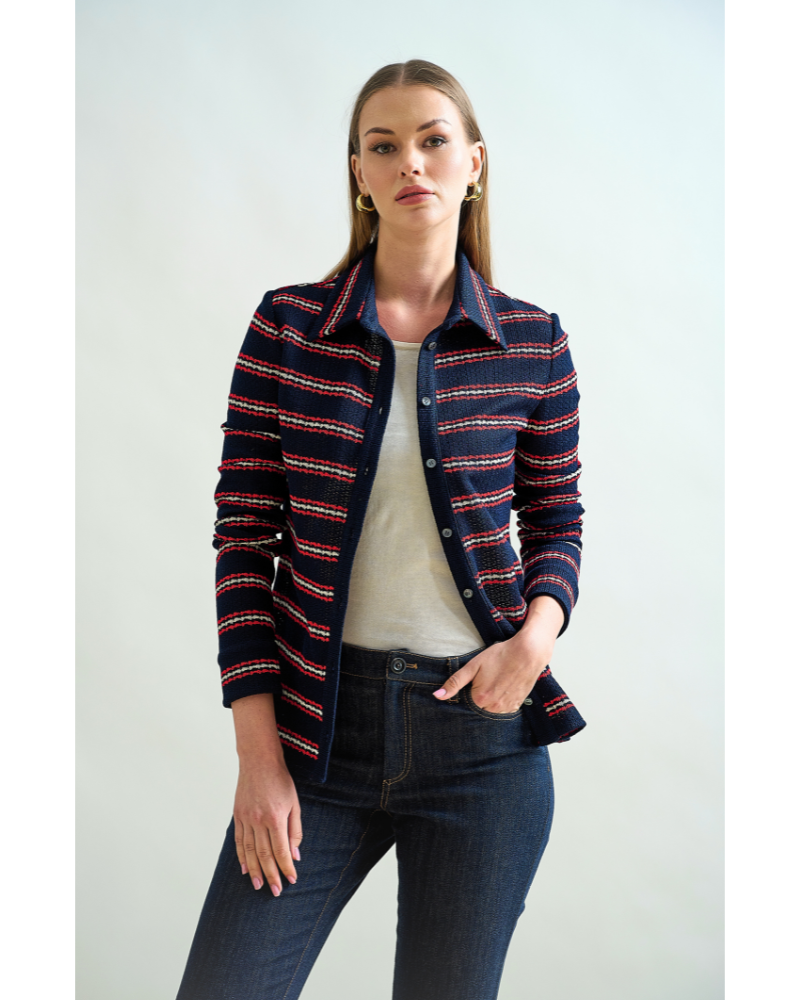 Button-front shirt crafted from soft jersey in navy blue, accented with bold red and white stripes. A sporty-chic layer that blends comfort and style. MADE IN LAKE COMO, ITALY.