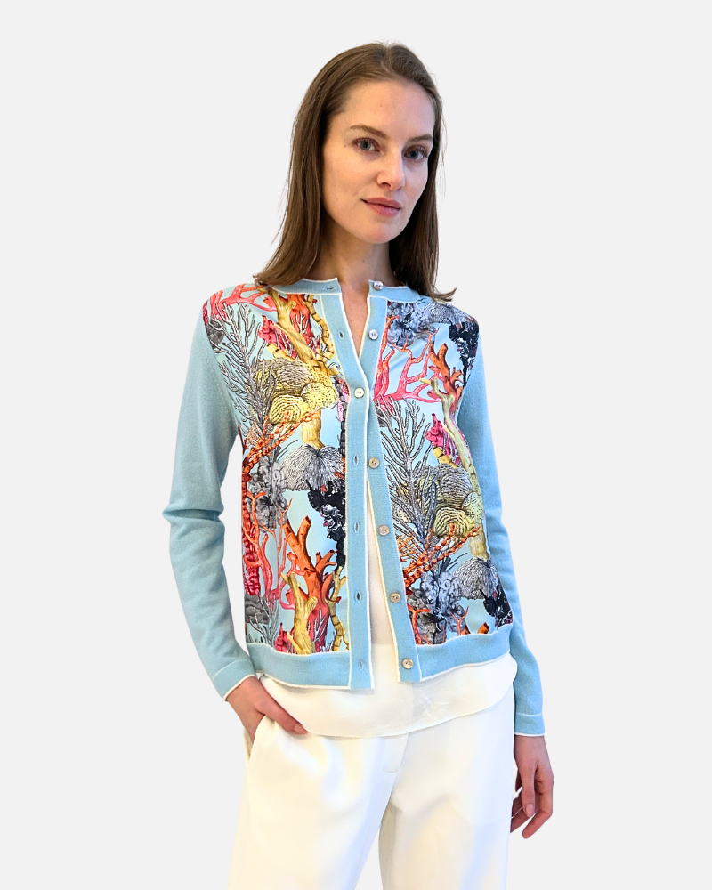 Luxurious blue cashmere cardigan featuring cotton panels with the exclusive Coral print. A refined mix of softness and structure, combining knit comfort with printed sophistication. MADE IN LAKE COMO, ITALY.