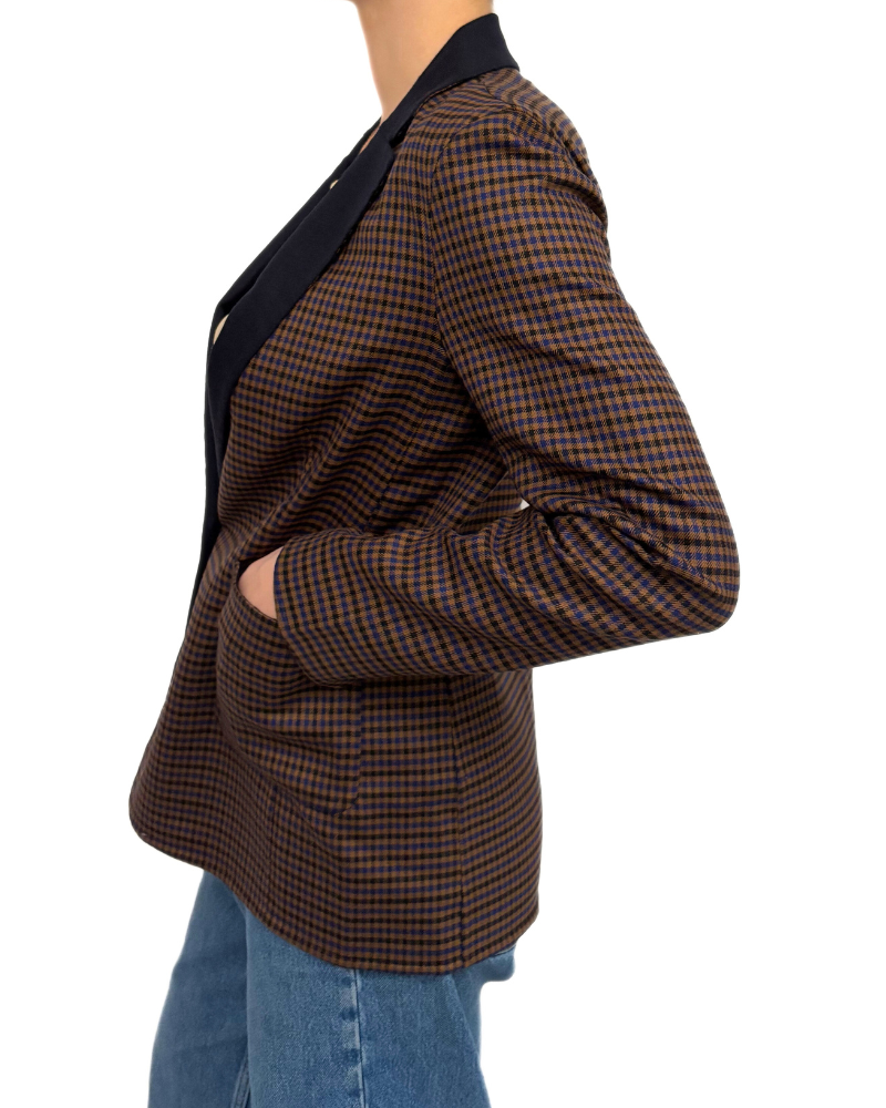DOUBLE FACE STRETCH WOOL 1-BUTTON BLAZER: PLAID BROWN-SOLID NAVY