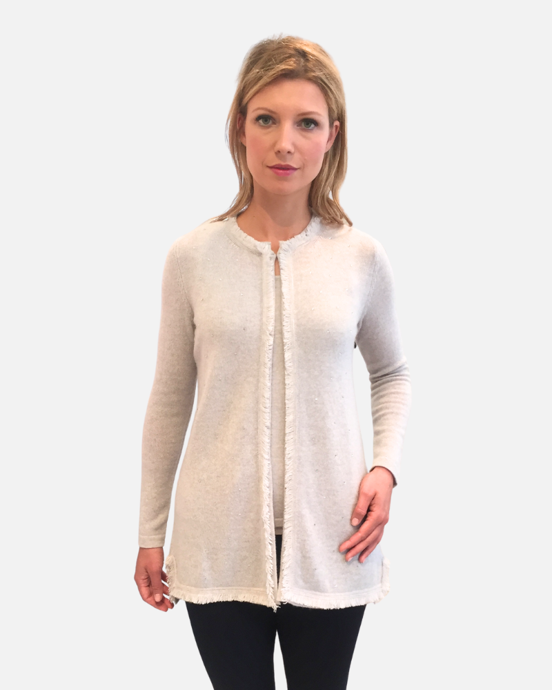 Feather weight cashmere long cardigan with fringes and crystals. Made in Italy - 100% cashmere