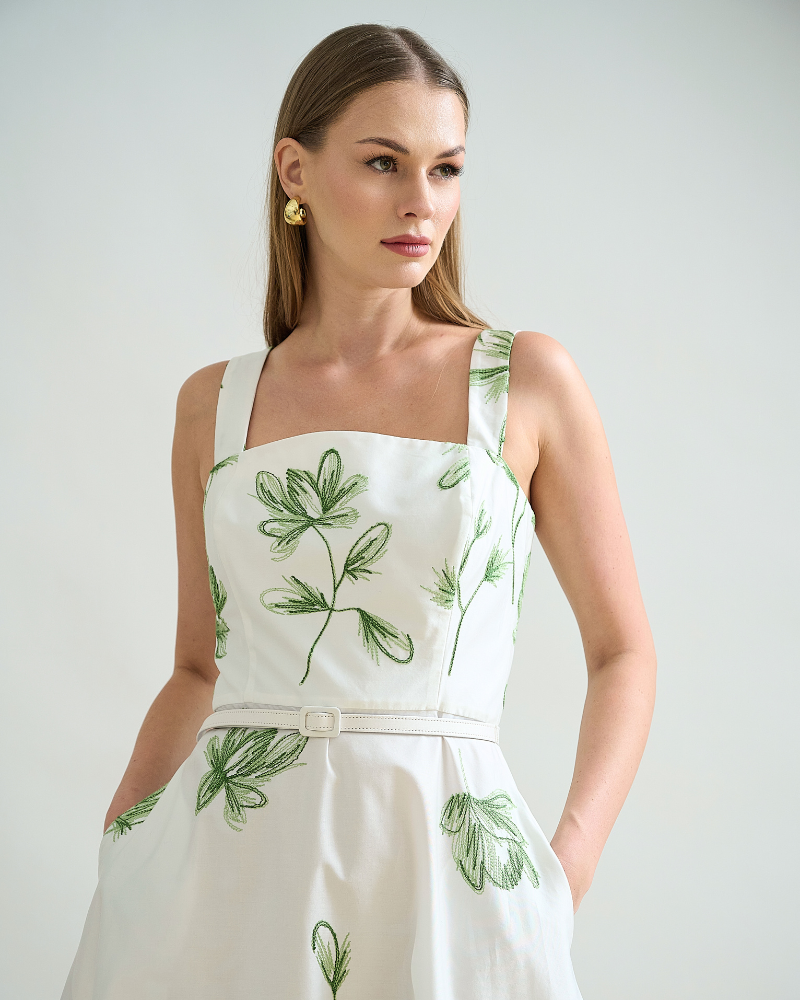 LONG COTTON STRAPS DRESS: IVORY WITH GREEN FLORAL EMBROIDERY