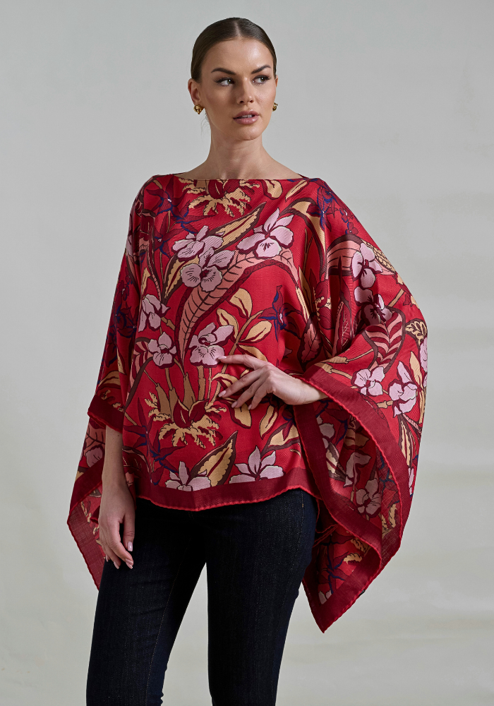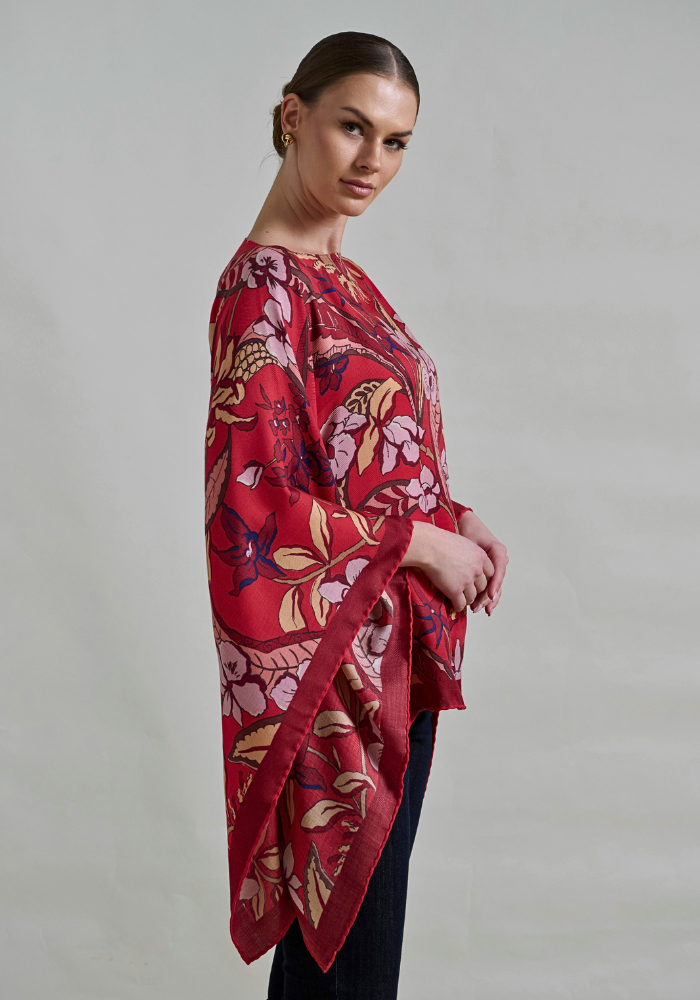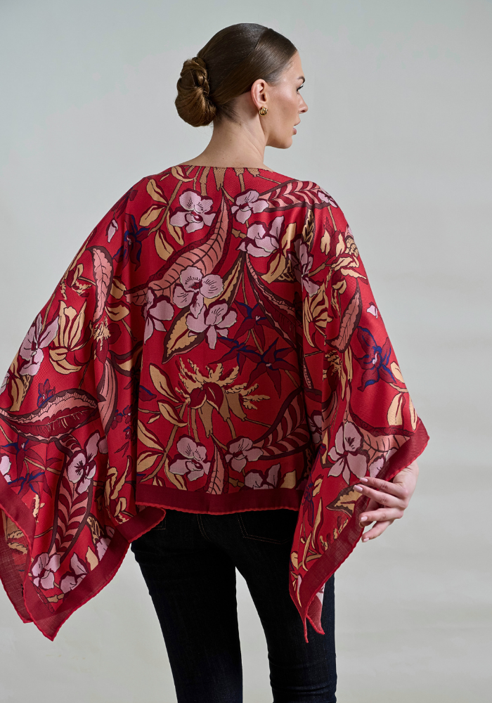 BEAUTIFUL ZANZIBAR CASHMERE PONCHO IN RED. HAND MADE IN LAKE COMO, ITALY.