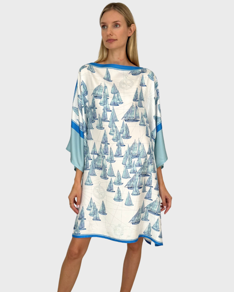 PRINTED SILK KAFTAN: BOAT: BLUE