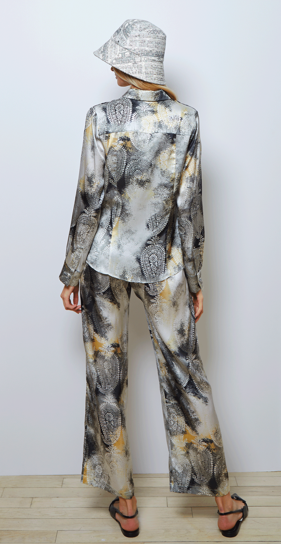 100% SILK PULL ON PANTS WITH FLAT FRONT ELASTIC BACK BELT: BATIK: SILVER