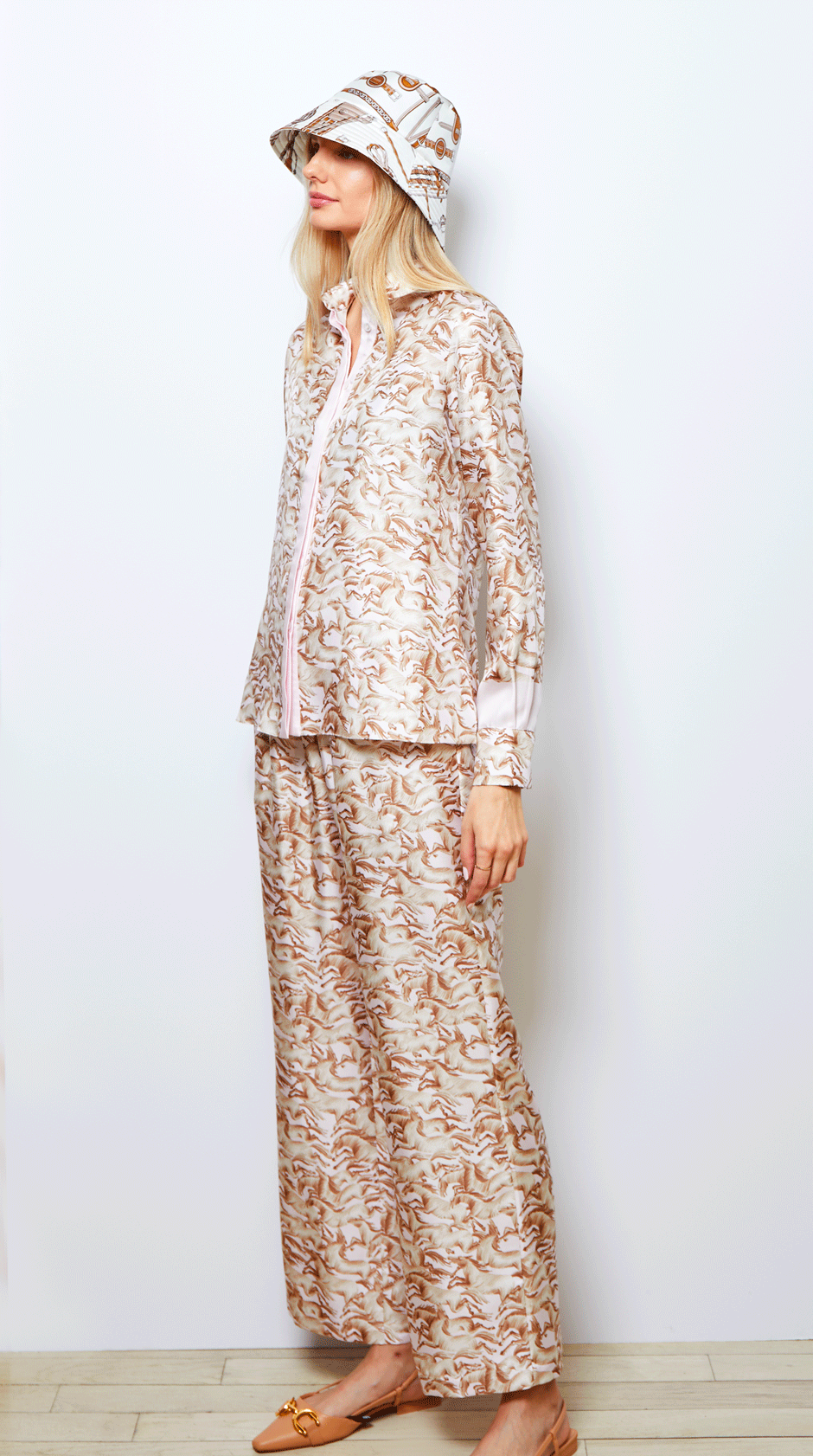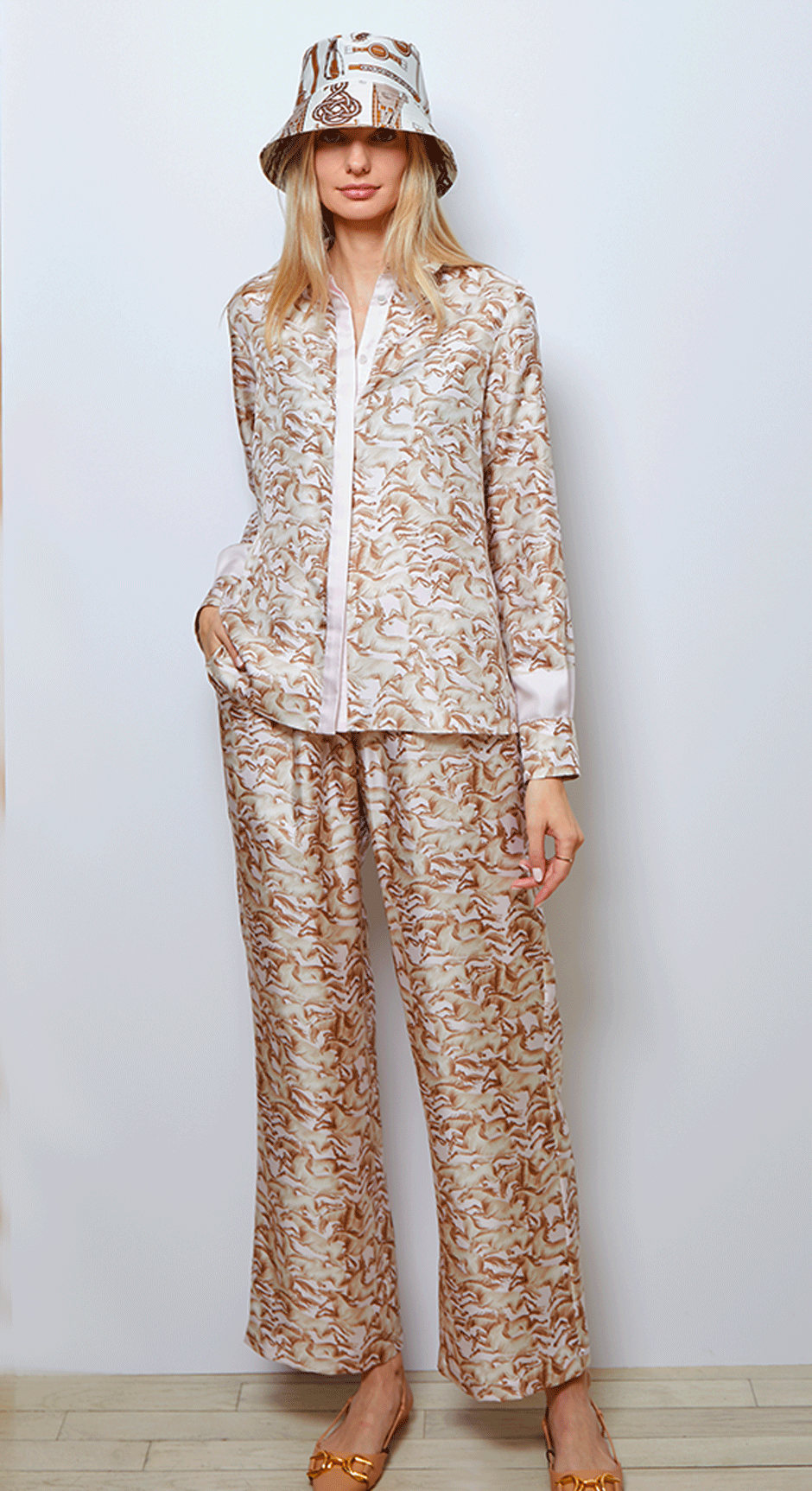 100% SILK PULL ON PANTS WITH FLAT FRONT ELASTIC BACK BELT: WILD HORSES: PINK
