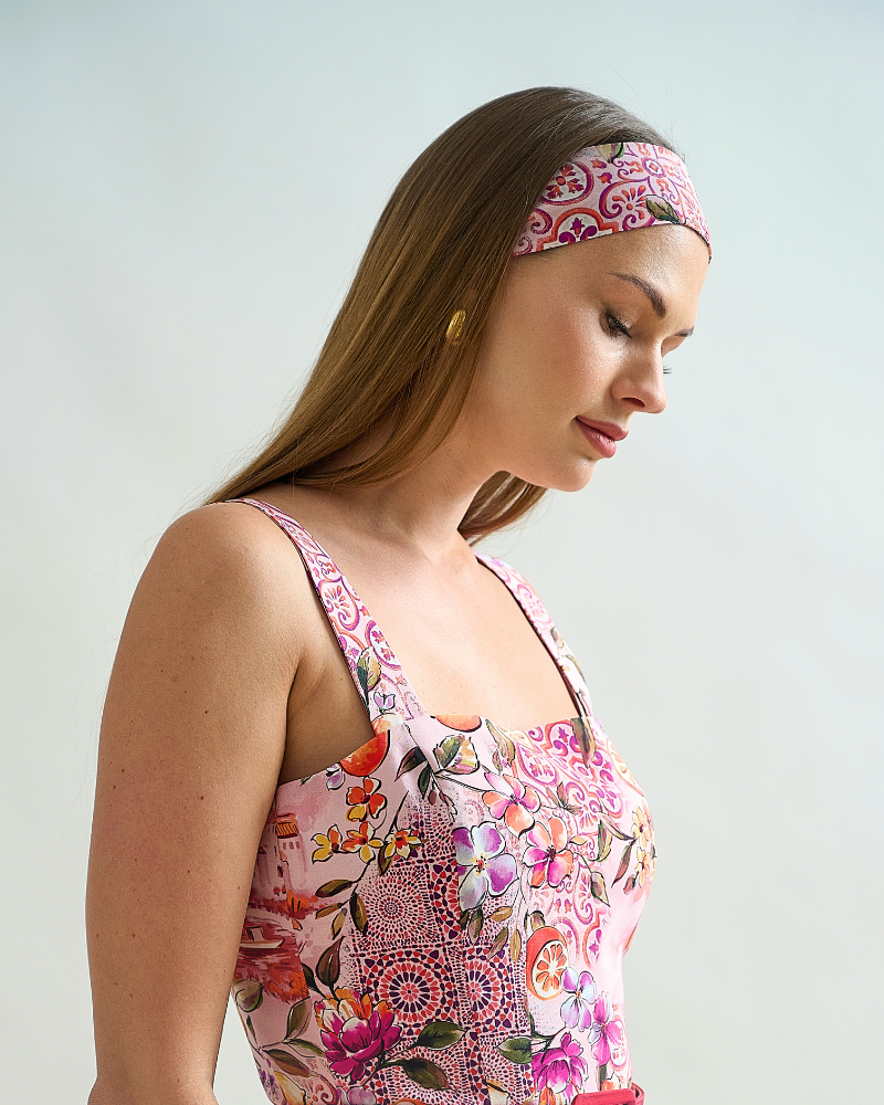 Elegant silk twilly scarf featuring a vibrant pink Capri-inspired print. Perfect as a hair accessory, necktie, or handbag detail. Luxuriously smooth and versatile. HAND MADE IN LAKE COMO, ITALY.