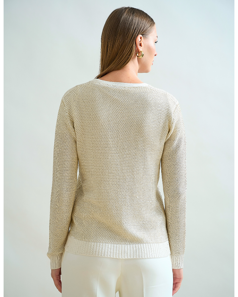 Elegant V-neck cardigan in a shimmering gold and ivory palette. Lightweight with subtle shine. MADE IN COMO, ITALY.